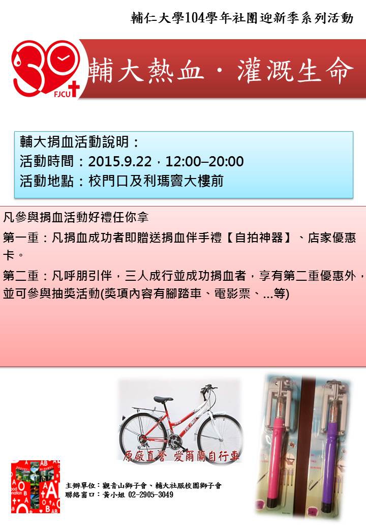 9/22(二)13:00-20:00 捐血爭神器,首波捐血贈品豐厚 -輔大熱血‧灌溉生命」