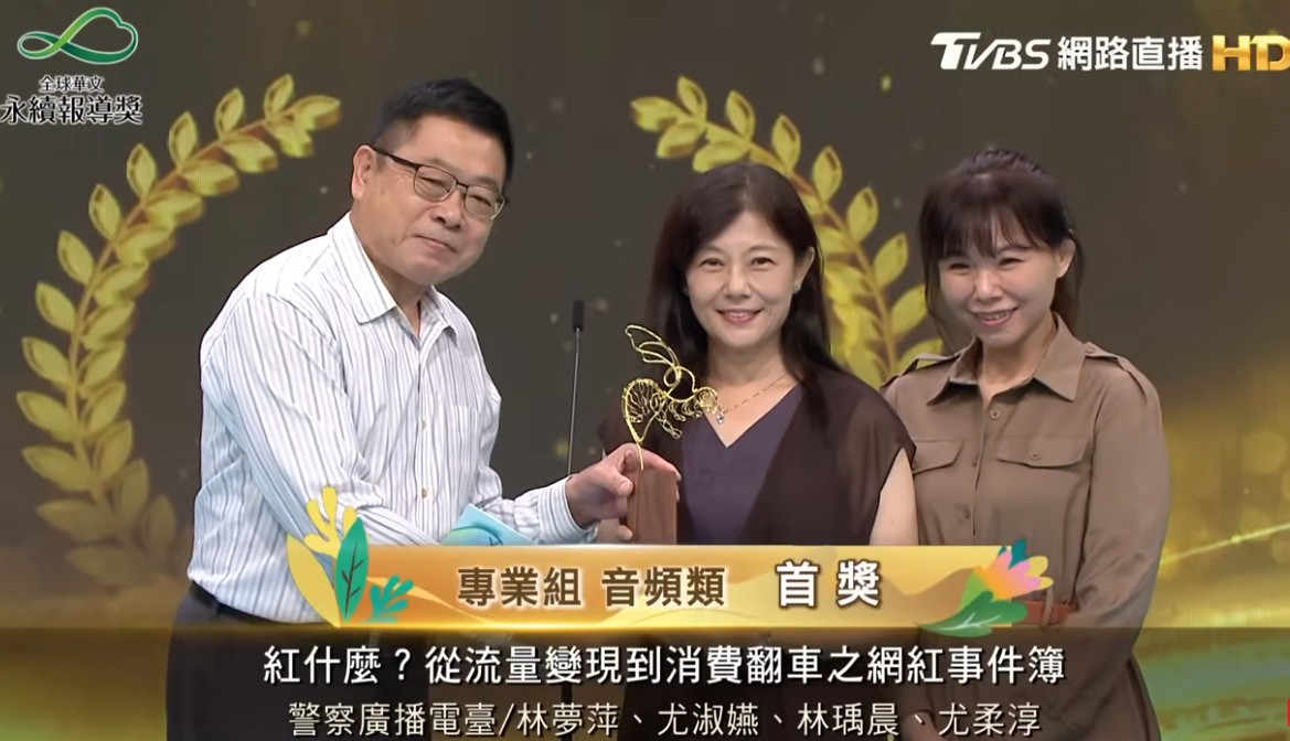 賀! 林夢萍老師與團隊以作品《紅什麼?從流量變現到消費翻車之網紅事件 簿》(警察廣播電臺)榮獲「2025球華文永續報導獎-專業組音頻類首獎」。