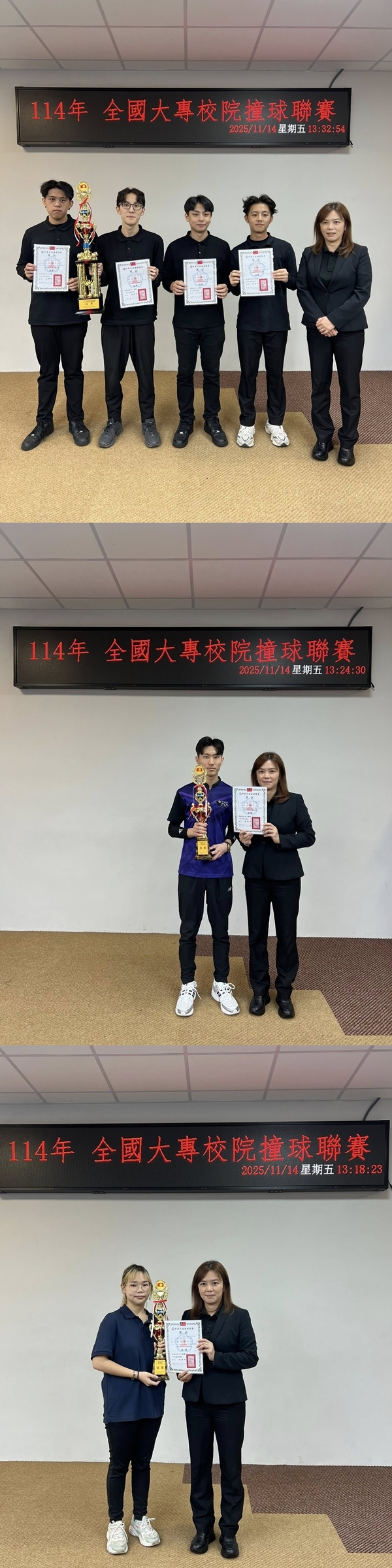 進修部運休學程114大專校院撞球聯賽奪得男團冠軍及男、女個人雙亞軍