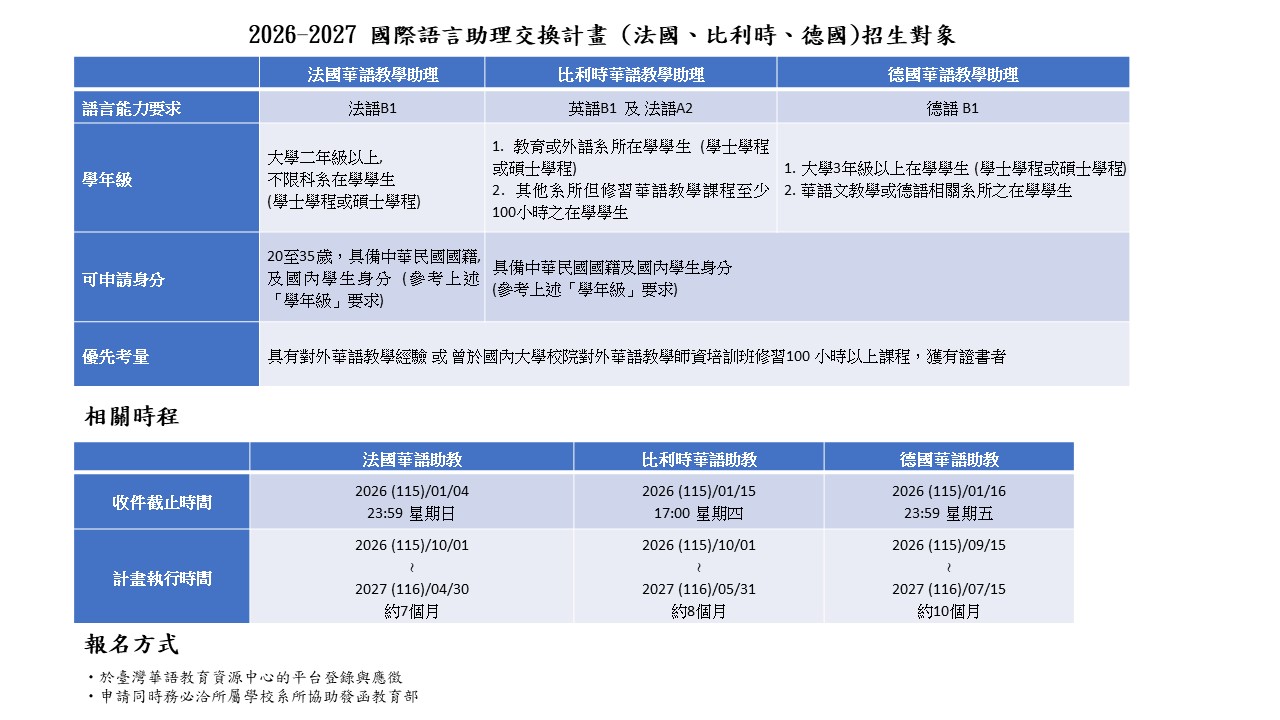 參與本計畫的語言助理,將於法、比、德三國協助華語教學與文化推廣,並透過實際教學情境提升語言能力、跨文化溝通技巧與國際視野。教育部與合作國政府也將提供多項支持,包括行前培訓課程、臺灣政府補助,以及當地政府提供的每月生活津貼,使學生得以安心參與海外教學與文化交流。