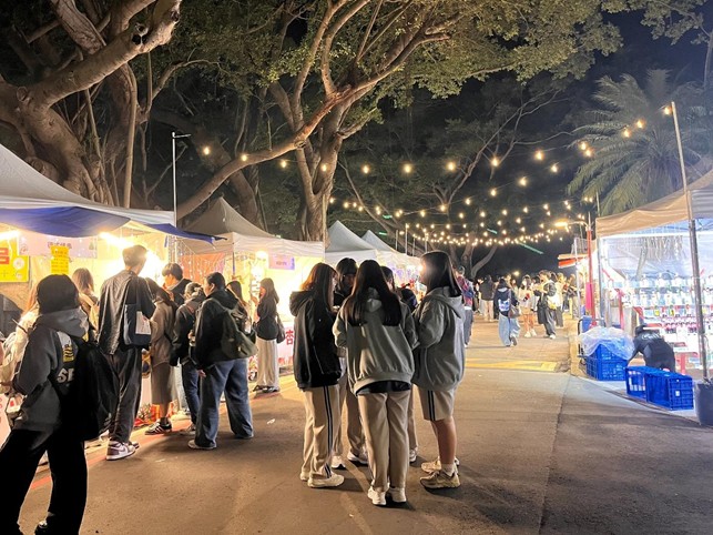 ▲圖說:夜幕低垂,聖誕市集在燈光妝點下熱鬧展開,多國美食與人潮交織,營造溫馨且充滿節慶氣氛的校園景象。(拍攝者:葉郁婕)