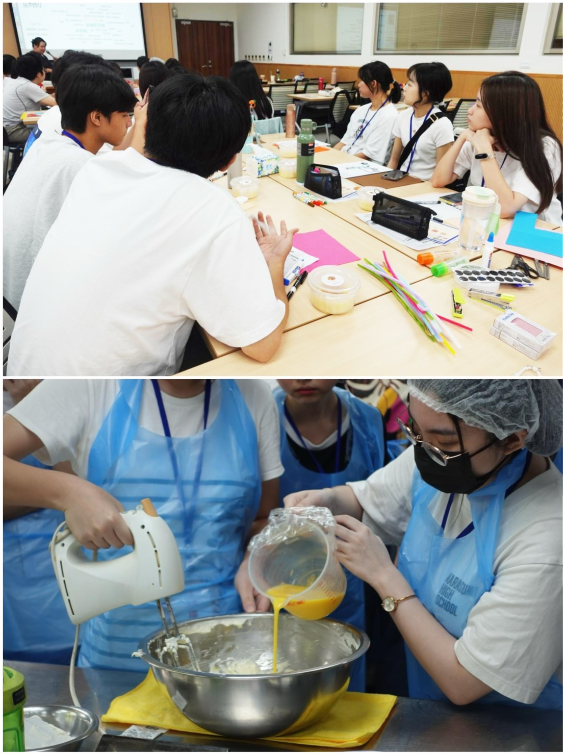 ▲上圖:設計思考迷你工作坊:發揮創意與同理心、下圖:義大利美食文化:同學合力製作巴斯克乳酪蛋糕
