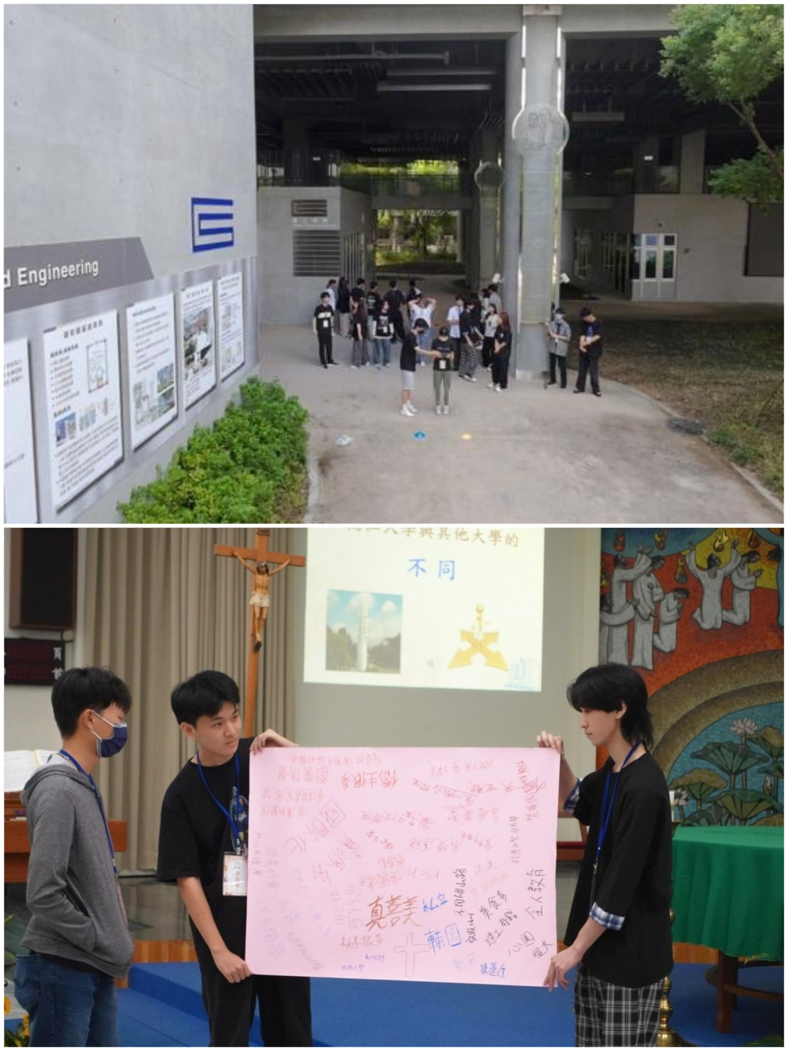 ▲上圖:學員練習操作無人機、下圖:淨心堂活動:了解輔大的特色
