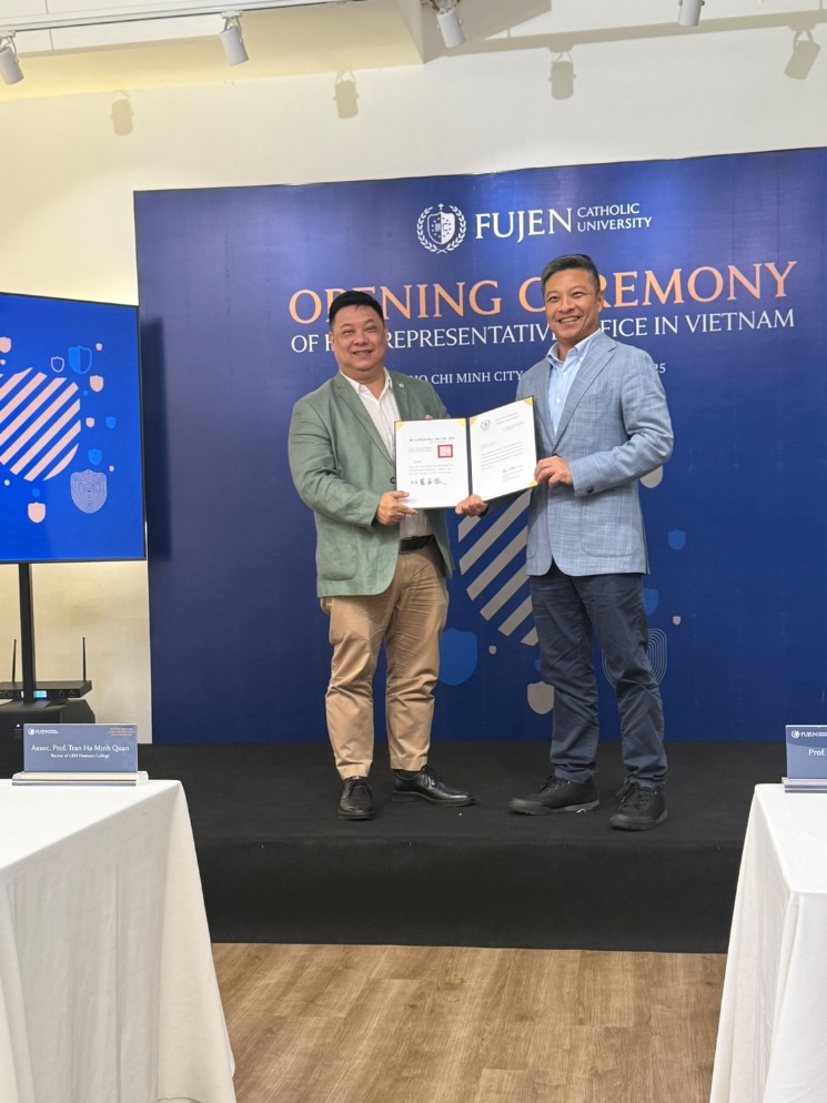 典禮的尾聲,輔仁大學頒授榮譽講座教授證書予胡志明市經濟大學國際商管學院的Tran Ha Minh Quan教授,以表彰其在教育與國際合作方面的貢獻。
