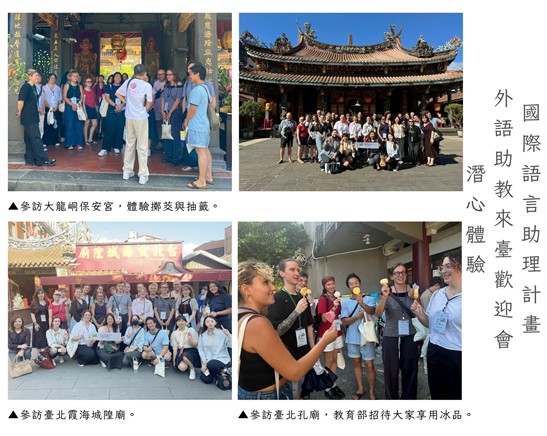 本次歡迎會下半日帶領外語助教前往臺北景點——大龍峒保安宮、臺北孔子廟、大稻埕,並預約英文導覽。在導覽人員的帶領下,外語助教不僅欣賞了廟宇建築之美,亦親身體驗「擲筊」與「抽籤」,大家興致盎然、反應熱烈,並表示:「之前只看過圖片,或在亞洲城看過簡單的宮廟風裝潢,這次能親眼看見、親身站在這些大廟之中,覺得很震撼,比想像中的更美麗、更壯觀。」透過這次親身體驗,助教們對臺灣民眾虔誠信仰背後的人文精神有了更深的理解,紛紛表示這段體驗令人印象深刻。