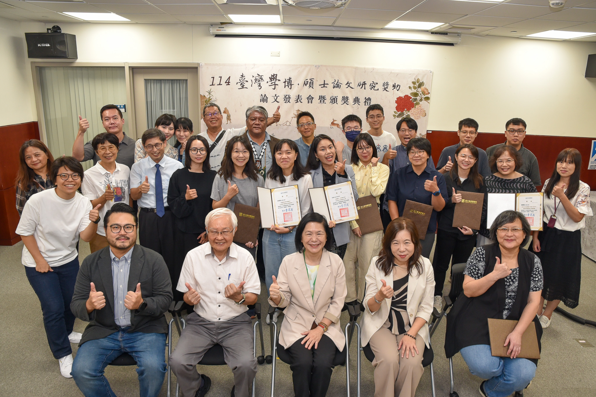 ▲國立臺灣圖書館舉辦「114年度臺灣學博碩士論文研究獎助發表會暨頒獎典禮」,藍麗霞同學(第二排右二)與其他獲獎者現場發表最新研究成果,展現臺灣學研究的多元面向與深厚學術能量。前排由左至右依序為:輔仁大學博物館學研究所副教授王廷宇、國立臺灣師範大學歷史學系名譽教授吳文星、國立臺灣圖書館館長曹翠英、國立臺灣大學臺灣文學研究所教授黃美娥、國立政治大學民族學系副教授王雅萍。(國立臺灣圖書館提供)