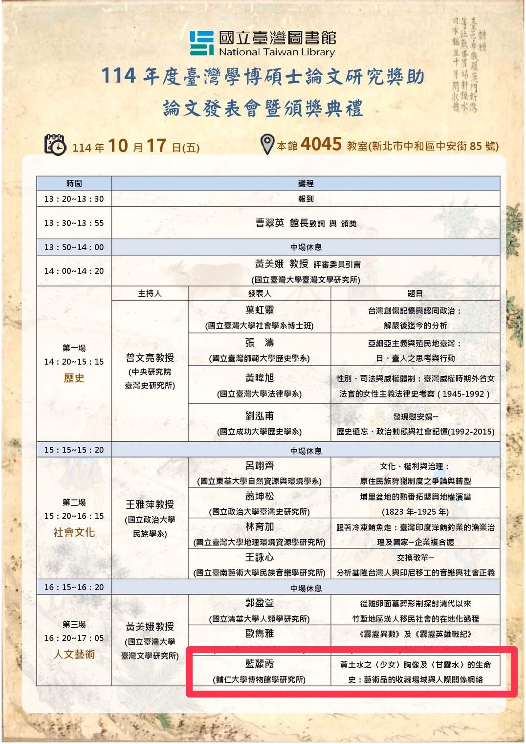 博館所研究生藍麗霞獲「 國立臺灣圖書館114年度臺灣學博碩士論文研究獎助 」優等