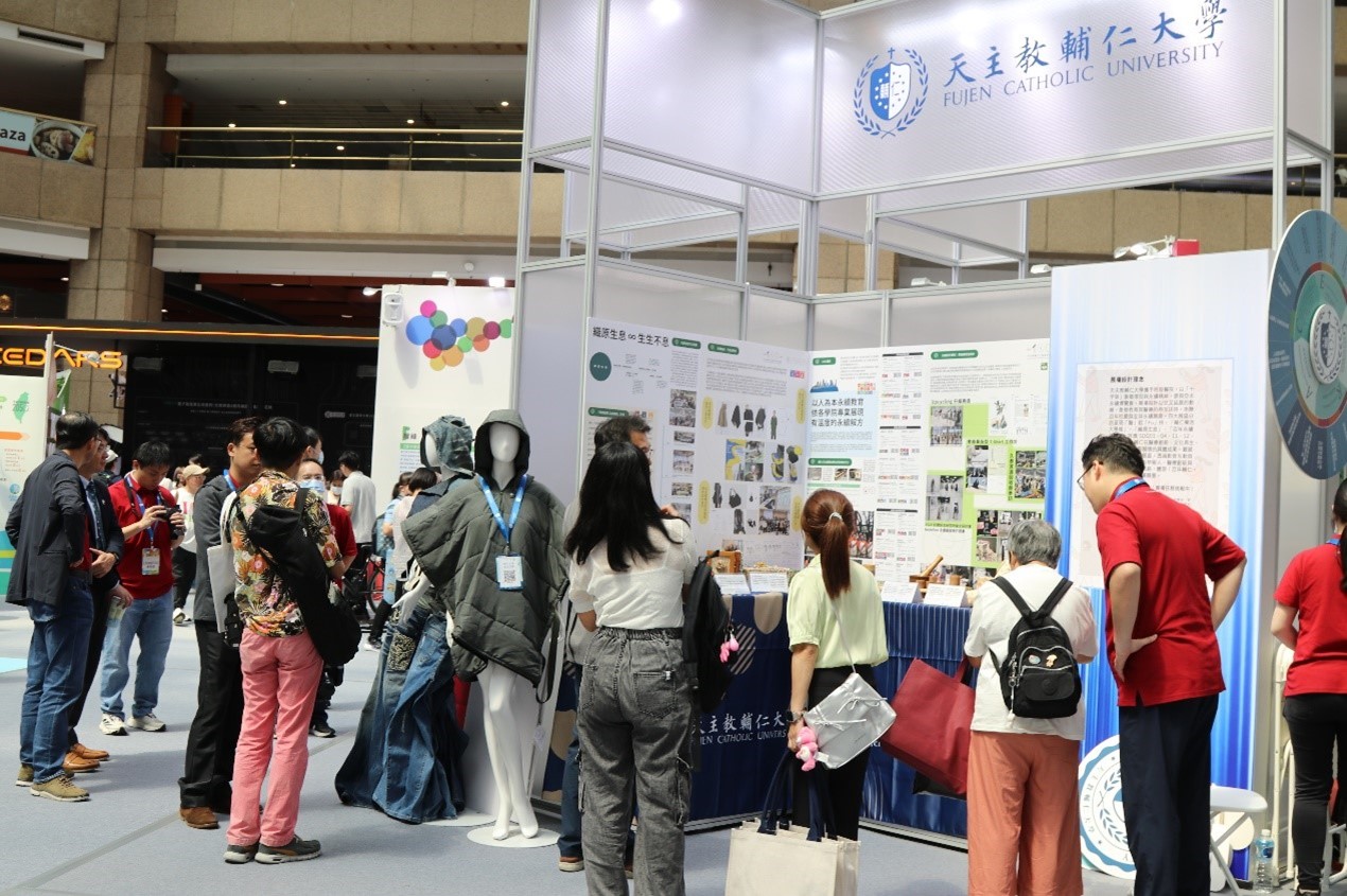 展區更以十字架造型為特色主軸,串聯四大主題區。「永續領航」與「織原生息」共同呈現輔仁在教育與文化層面的永續實踐。「永續領航」區聚焦校史與USR計畫,展出學生創作的「新莊文化地圖」、文創作品如「五菜脯」與「金紙造型蠟燭」,傳達青年對社區的關懷與創意。「織原生息」則展出織品學院師生以廢布料製作的「烏克蘭關懷包」與保暖斗篷,呼應國際人道需求;原住民族長者手工編織的竹籃、項鍊與樂器,更象徵輔仁推動「文化照顧」與「照顧文化」的雙向理念。