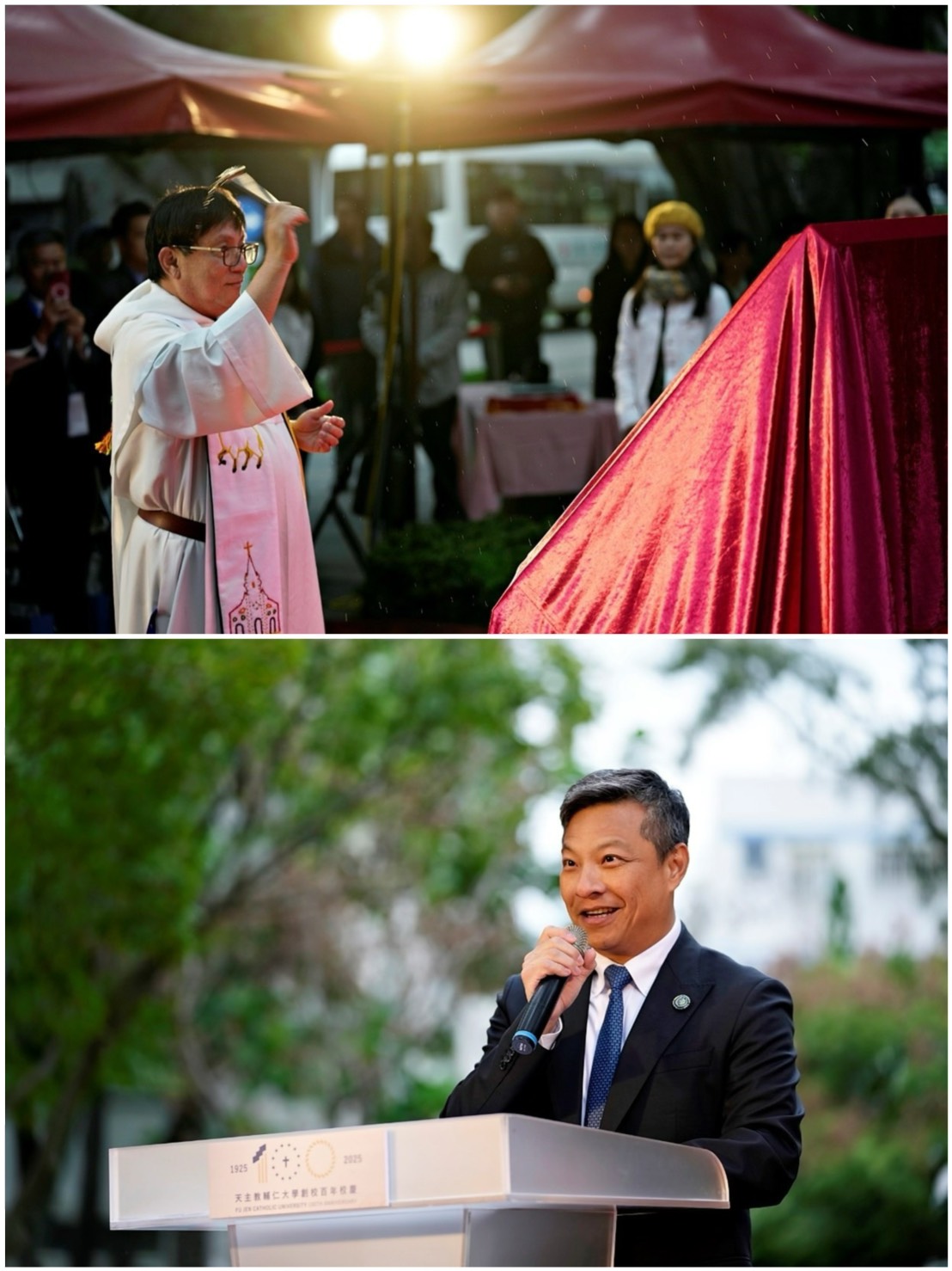 ▲ 上圖:校牧為大樹紀念牌揭牌祈禱與灑水降福;下圖:校長致詞感謝所有樹木認養者