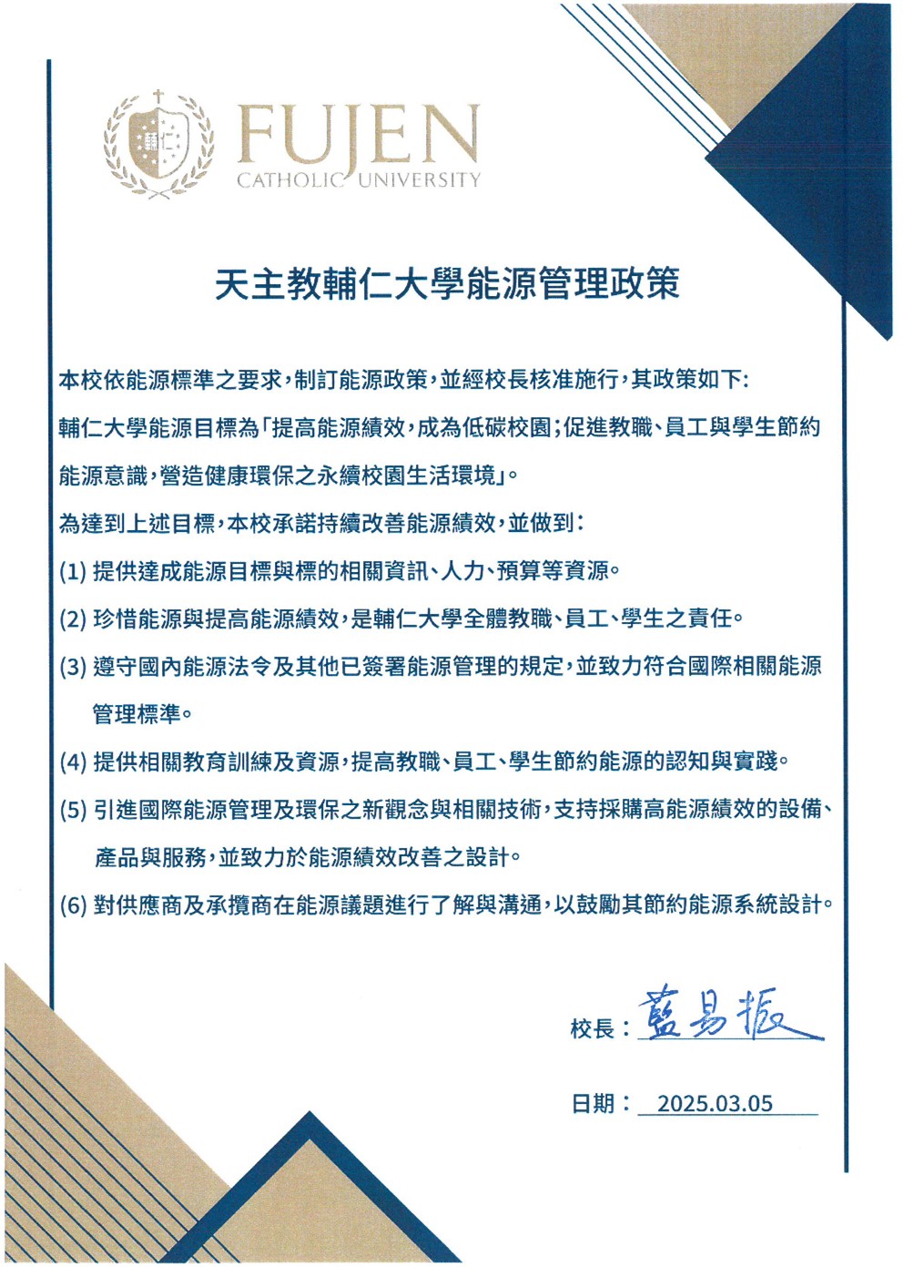 輔大自 2024 年正式啟動能源管理系統建立計畫,以具體行動實踐聯合國永續發展目標(SDGs)。2025年3月校長核定「輔大能源管理政策」,後續11月完成 ISO 14064-1 認證,對全校溫室氣體排放進行全面科學盤點,釐清能源消耗熱點。隨後,導入IOS 50001能源管理系統(EnMS),宣告輔仁能源政策,全校各單位總動員,共同建立輔仁能源審查與目標管理,於今年年初接受SGS台灣檢驗科技團隊為期三天的實地評審,並獲SGS向TAF推薦註冊其為符合ISO 50001:2018要求之組織,驗證範圍包含教學及研究服務等範疇。