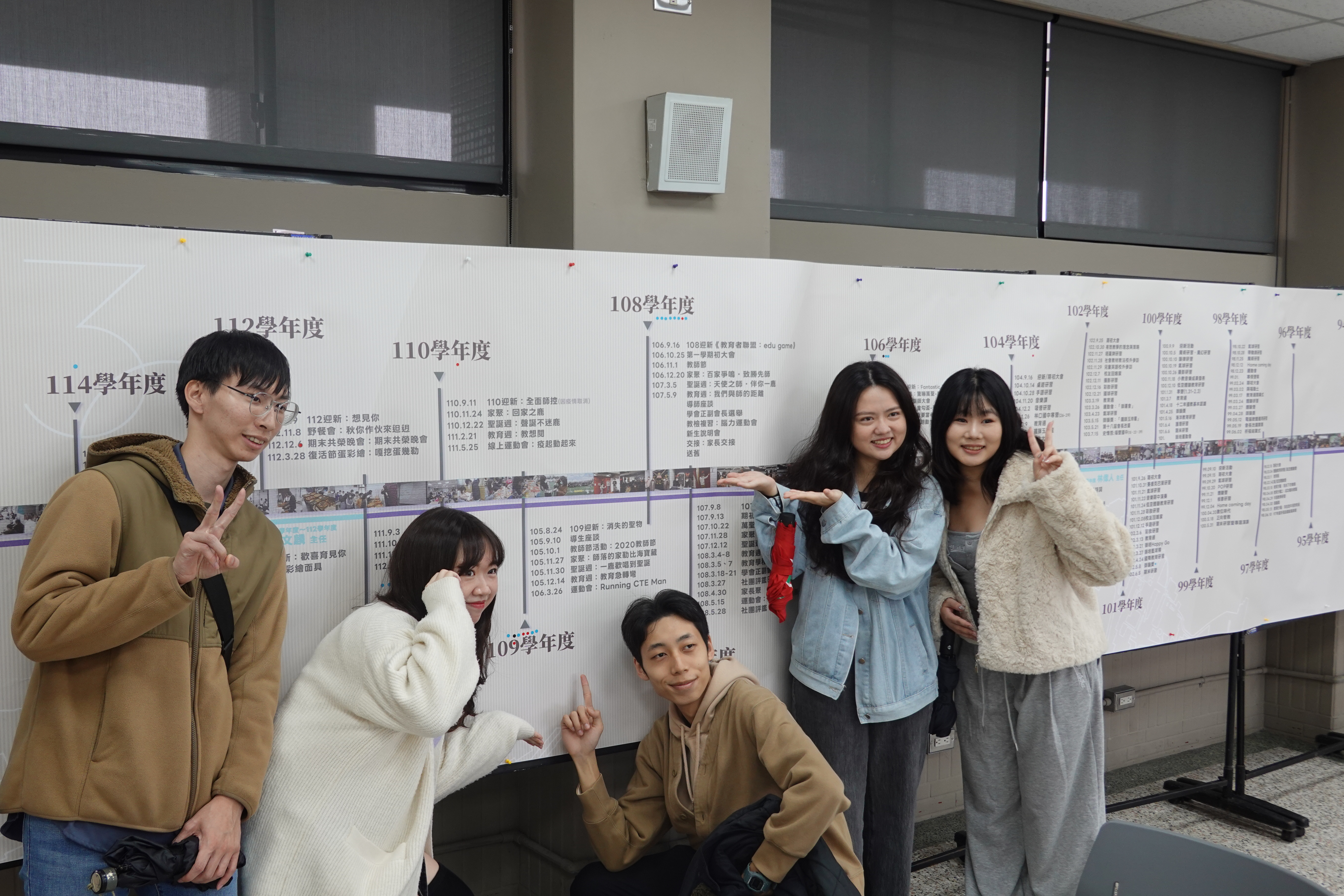 校友與時光館內紀事時間軸牆面合影