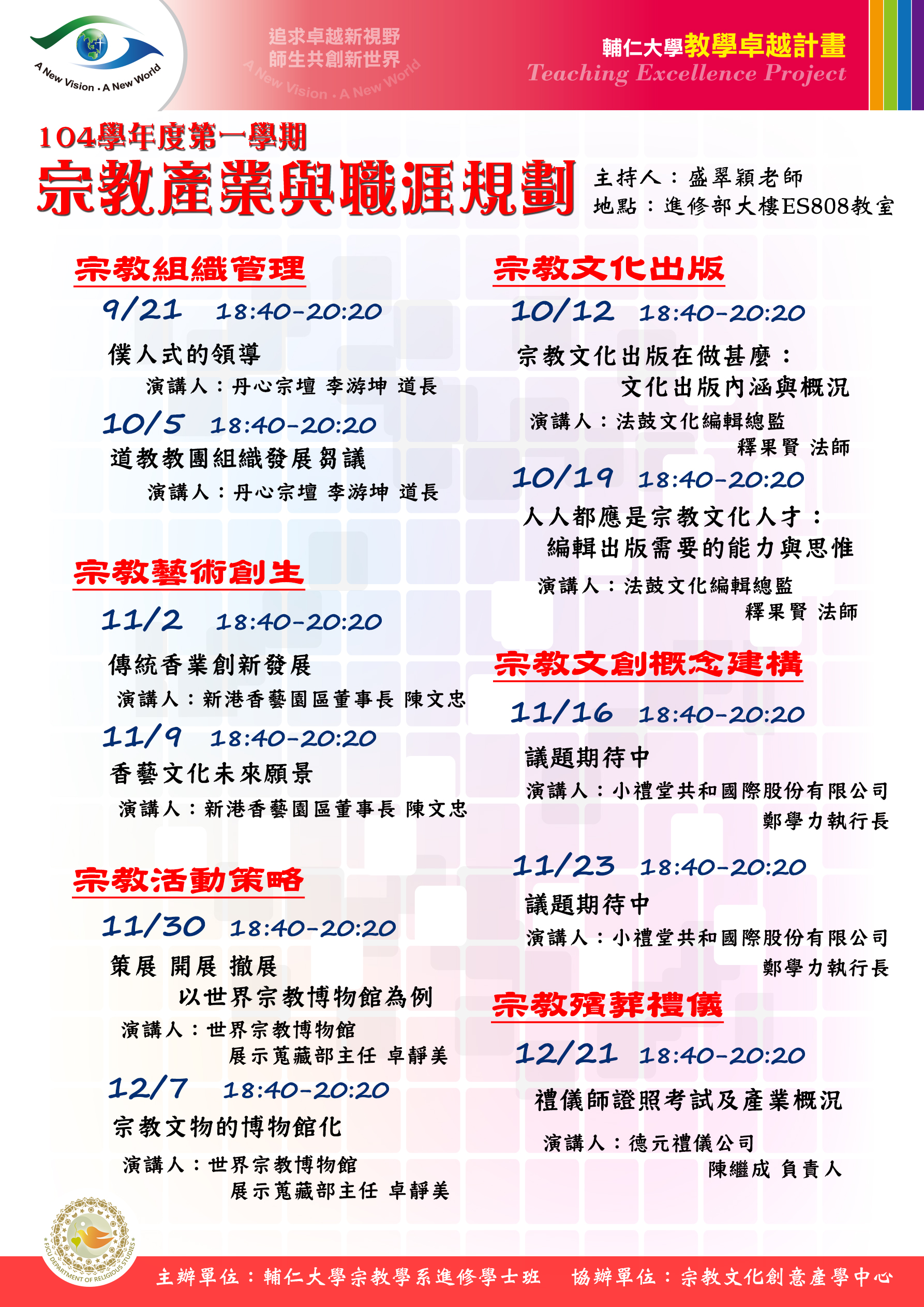 本次系列演講,邀請各類宗教產業專家到班講述其專業知識、分享執業經驗,為學習者提供足以參考之就業或創業資訊與指導,期盼能提升學習者之學習興趣與信心,為個人之職涯規劃提早做好準備。