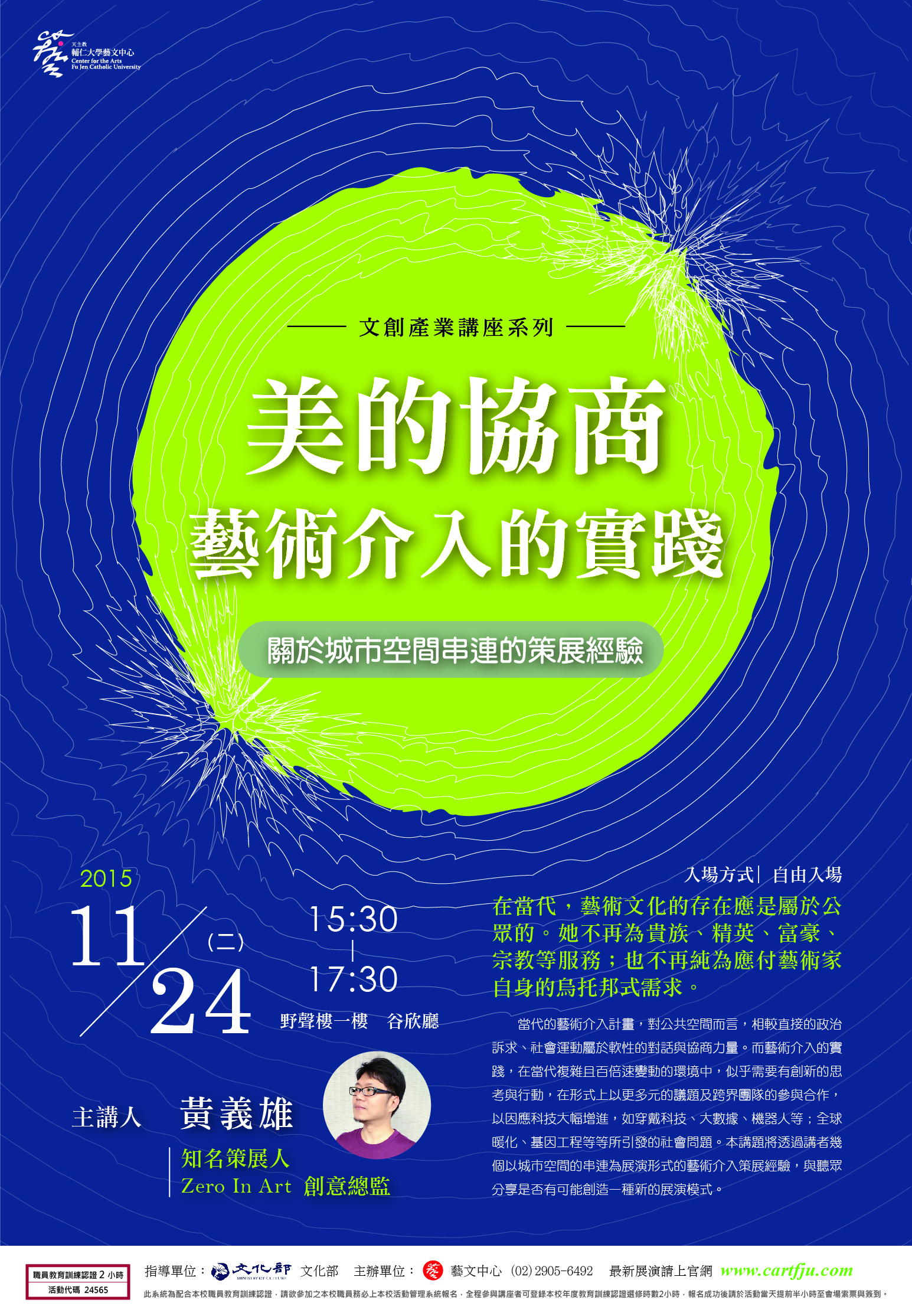 11/24(二)下午15:30在輔大野聲樓谷欣廳(靠近校正門口)舉辦文創跨界講座。