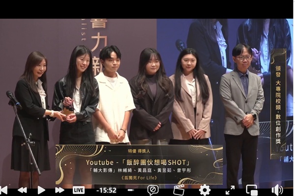 ::: 賀!影像傳播學系系友林湘綺、黃昌庭、黃昱茹、曾宇彤 榮獲第五屆銀響力新聞獎大專院校類數位創作獎特優! 2025-09-22 本校影傳系系友 林湘綺、黃昌庭、黃昱茹、曾宇彤 以電視專題紀錄片《孤獨死 For Life》,榮獲「第五屆銀響力新聞獎」大專校院類數位創作獎特優! 訊息來源:https://reurl.cc/vLbNl1