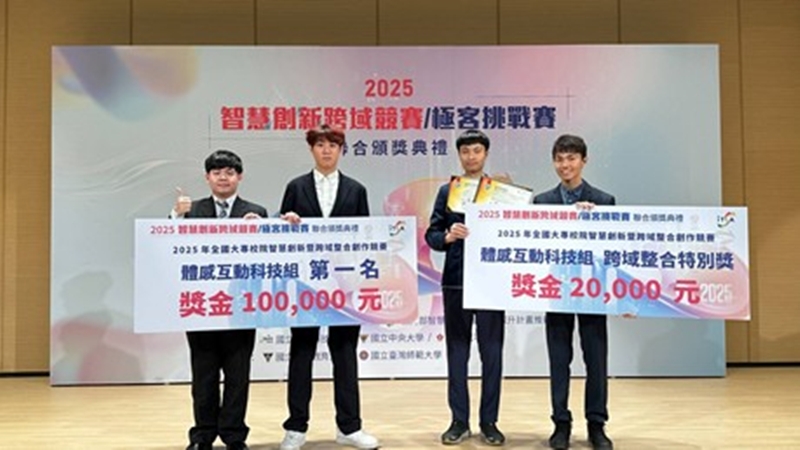 為鼓勵全國大專校院培養智慧創新跨域整合人才,由教育部指導、國立中央大學主辦設立「全國大專校院智慧創新暨跨域整合創作競賽」,本校創新創業國家隊學生在2025年的比賽中大放異彩。本校學生施淞礬(職治四)、嚴裕堯(法文四)、與臺北商業大學、臺北醫學大學的同學,共同組成「云磐淞科」跨校團隊,在企管系黃凱斌老師指導下,以《AI職能治療智慧輔助系統》勇奪「體感互動科技組」第一名及「跨域整合特別獎」雙項殊榮,展現跨域整合與智慧創新的亮眼成果。
