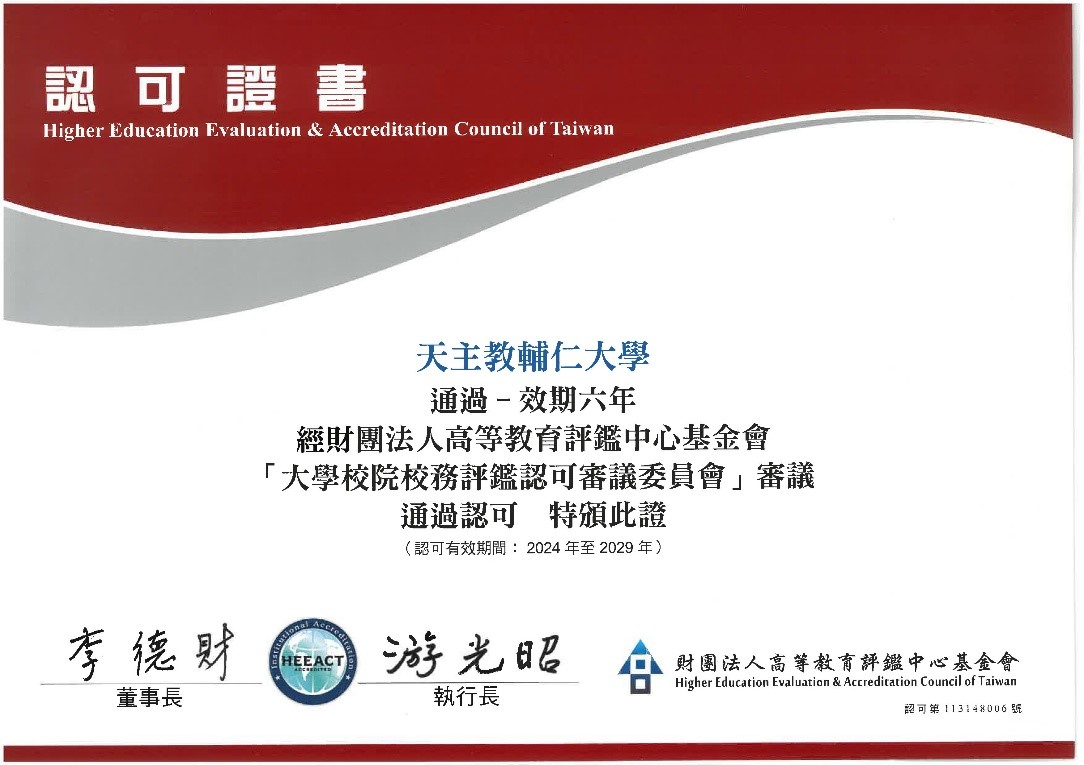 第一週期-100上半年:「學校自我定位」、「校務治理與經營」、「教學與學習資源」、「績效與社會責任」、「持續改善與品質保證機制」五大項目全數通過。 第二週期-107下半年:「校務治理與經營」、「校務資源與支持系統」、「辦學成效」、「自我改善與永續發展」四大項目全數通過。查詢【評鑑結果】。 第三週期-113下半年:「校務治理與經營」、「教師教學與學術專業」、「學生學習與成效」、「社會責任與永續發展」四大項目全數通過。 ![]()