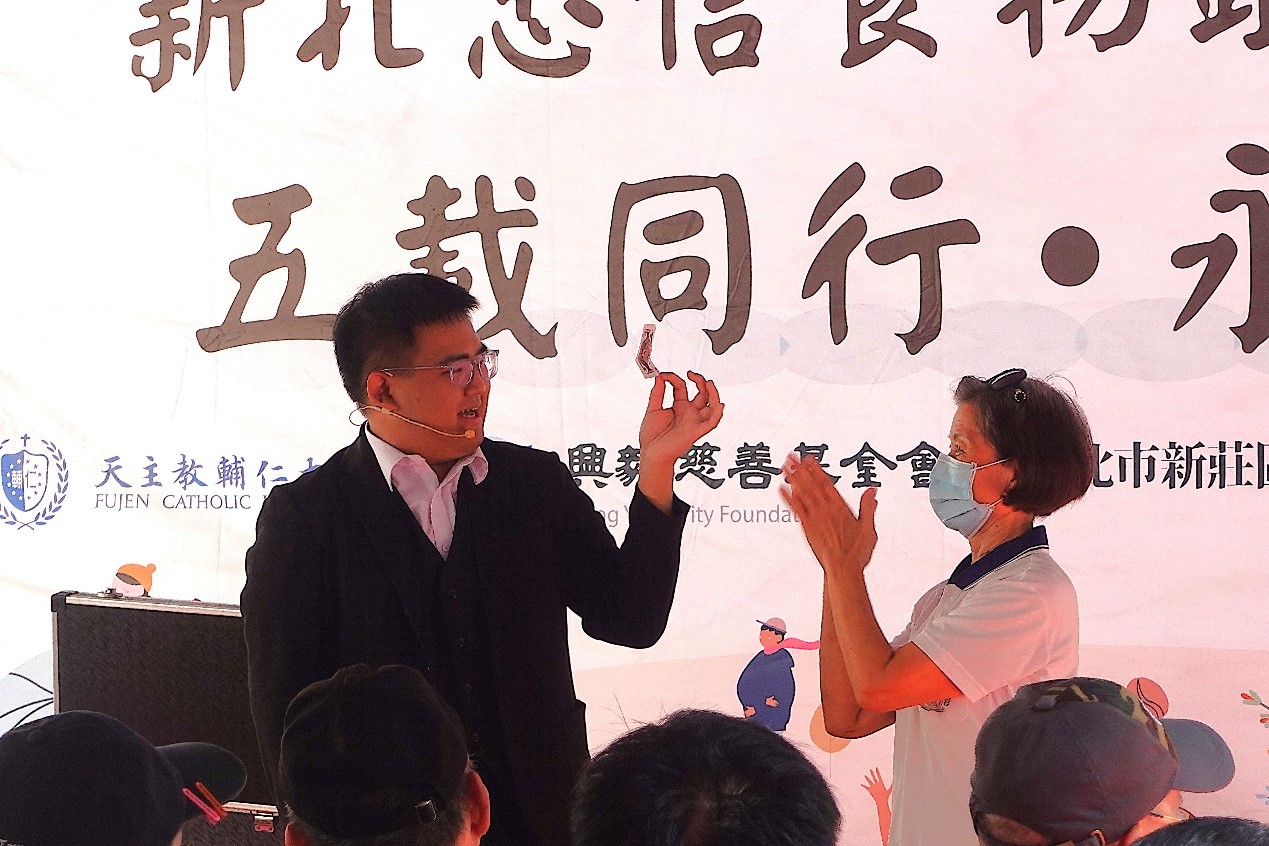 ▲輔仁大學魔術社代表學校演出,慶祝食物銀行五週年