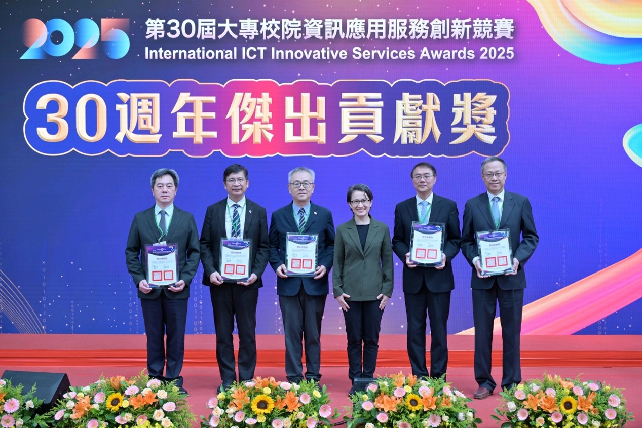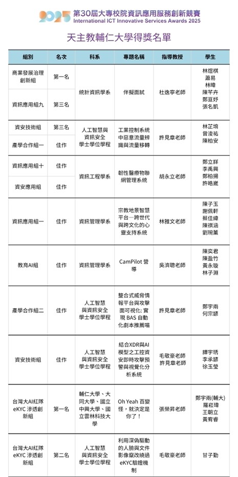 輔仁大學在此次賽事表現亮眼,由統計資訊學系、資訊管理學系、人工智慧與資訊安全學士學位學程及資訊工程學系共 9 支團隊勇奪 12 項大獎,展現輔大在資訊應用、AI 與資安領域的深厚實力。更獲主辦單位肯定,由蕭美琴副總統頒發 30 週年「傑出貢獻獎」,肯定本校在推動資訊教育、深化產學連結及培育創新人才上的卓越成果。