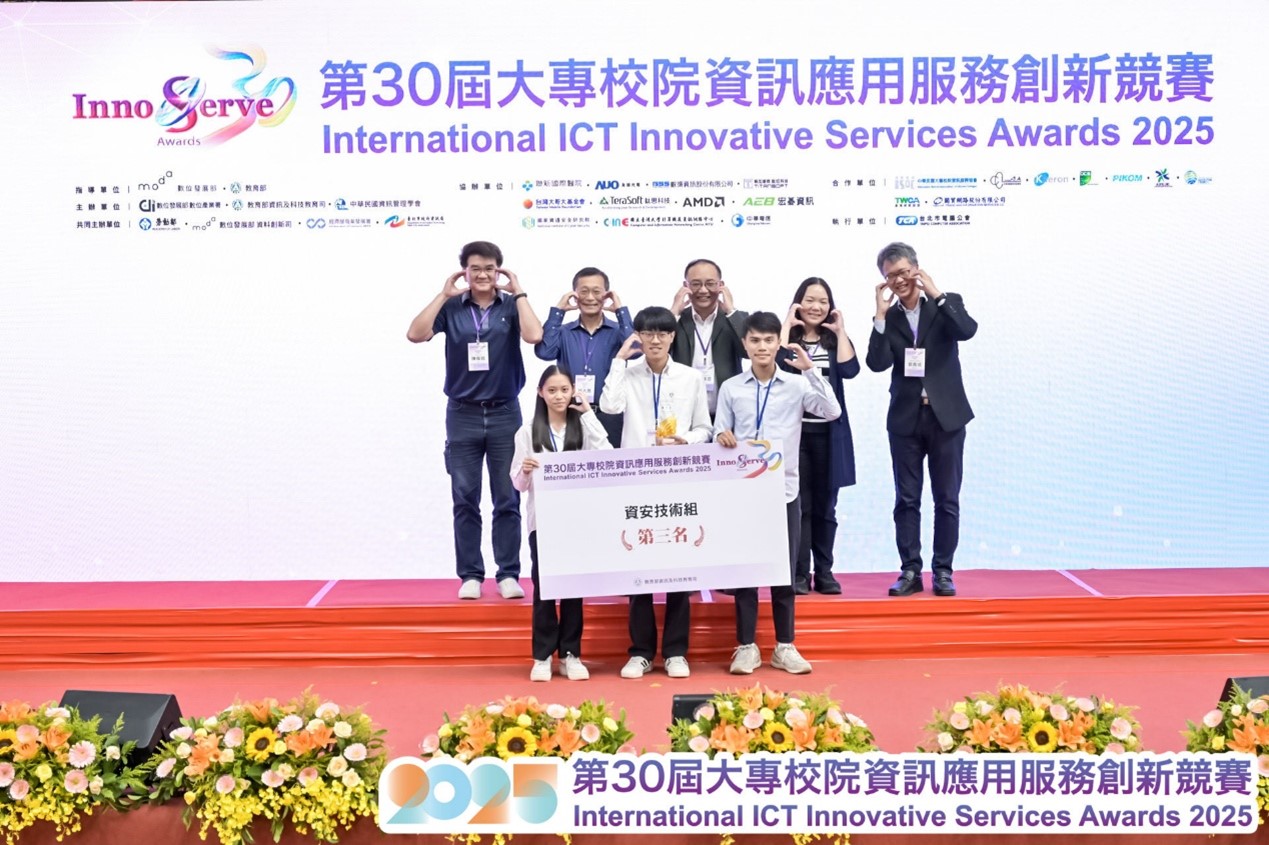 人工智慧與資訊安全學士學位學程許見章老師指導林芷堉、曾浚祐、陳柏安,以「工業控制系統中惡意流量辨識與流量移轉」同時拿下【資安技術組】第三名及【產學合作組一】佳作,展現結合 AI 與工控資安的創新成果。許見章主任表示,學程自113學年第一屆大四學生開始,便推動資安專題Capstone及學習成果參與 InnoServe 競賽,榮獲產學合作組第二名及資安技術組第三名。今114學年第二及第三屆學生更展現優秀成果,在「資訊安全技術」組、「產學合作」組與「台灣大AI紅隊eKYC 滲透創新」組獲得6個獎項,實屬不易。他感謝智慧資安學程全體教師努力及業師辛勤指導,充分發揮產業出題學生解題及動手實作的實力。近年來,學程已招收許多具人工智慧及資安專長學生,期待明年會有更豐盛的成果。