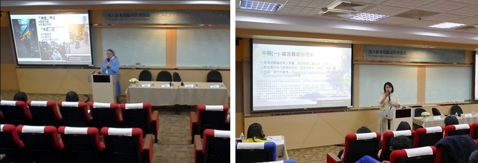 ▲圖說:輔大附設醫院使命副院長石台華修女分享「在不確定時代下,見證烏克蘭戰地的勇氣與希望」(左)。莊臆陵關懷師分享「靈性關懷師的靈性轉化歷程」(右)。