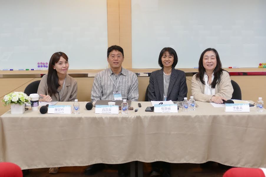 ▲圖說:輔仁大學陳若吟助理教授(左一)、高浩容哲學諮商師(左二)、DEBUG工作室創辦人吳靜雨(右二)和輔仁大學李惠美助理教授(右一)分享哲學實踐在哲學諮商、兒童哲學上的實務經驗。