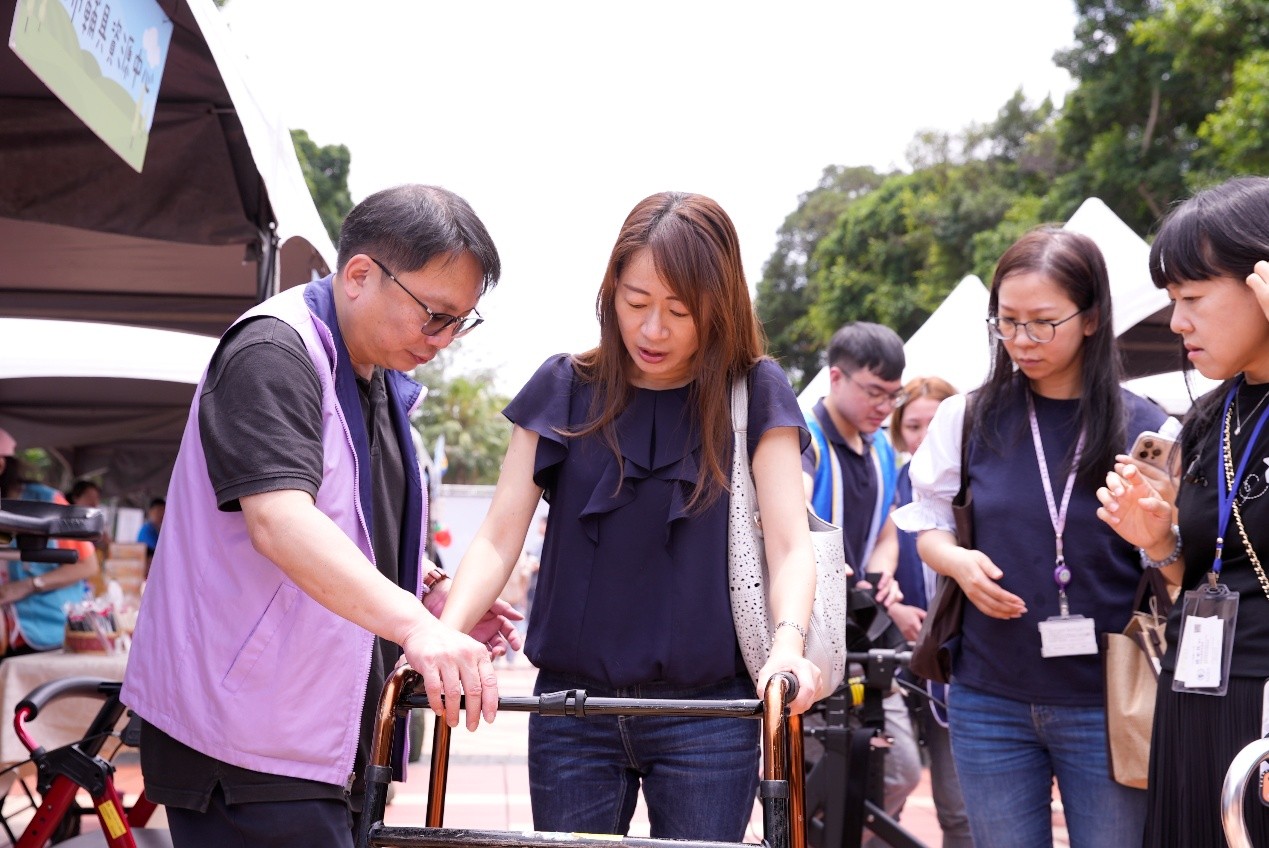 ▲特資中心主任(右一)陪同教育部許副司長(左二)進行輔具體驗,共同見證友善共融校園的成果。