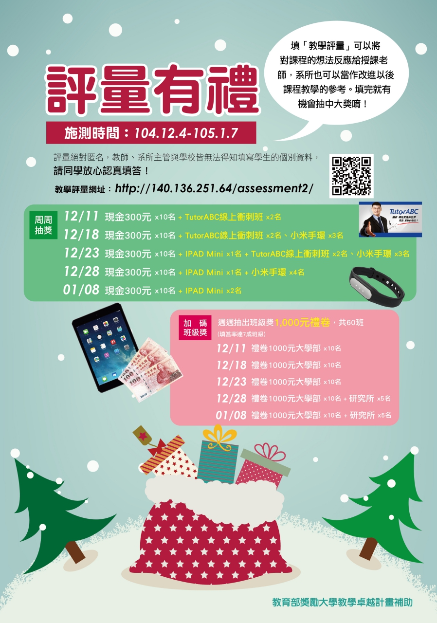 104學年度第1學期教學評量於即日起至105.1.7網路施測,週週好禮大方送,請踴躍填寫