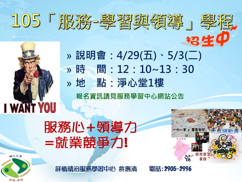 105學年度服務-學習與領導學程招生說明會~4/29、5/3中午