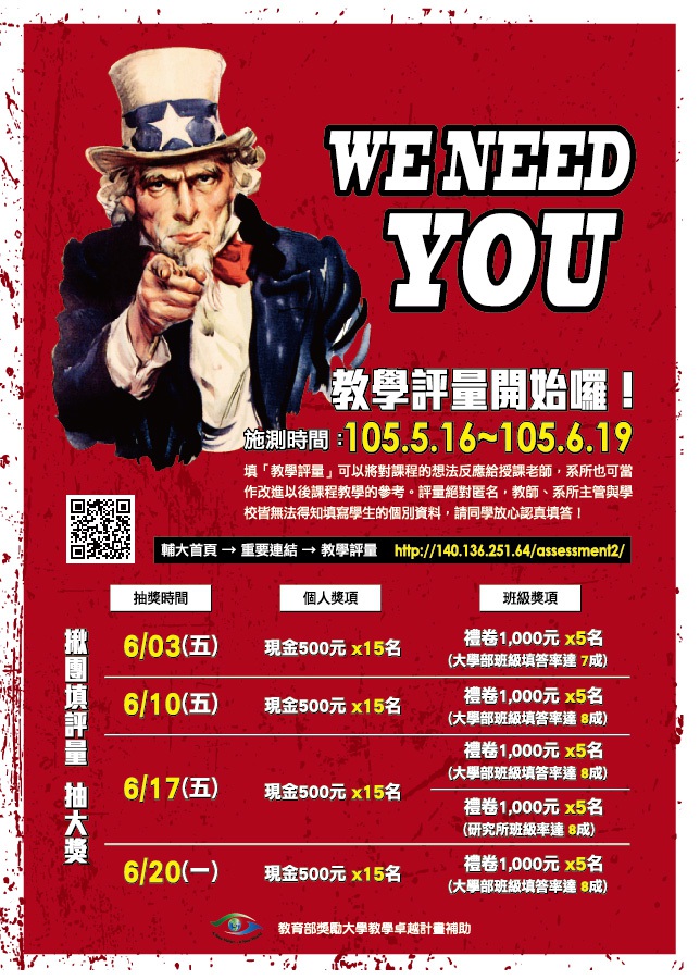另外還有填寫課程評量抽500元現金60名和班級獎金1,000元禮卷25班等多項大獎,請還沒有填寫的同學要把握時間,盡快上網填寫唷!