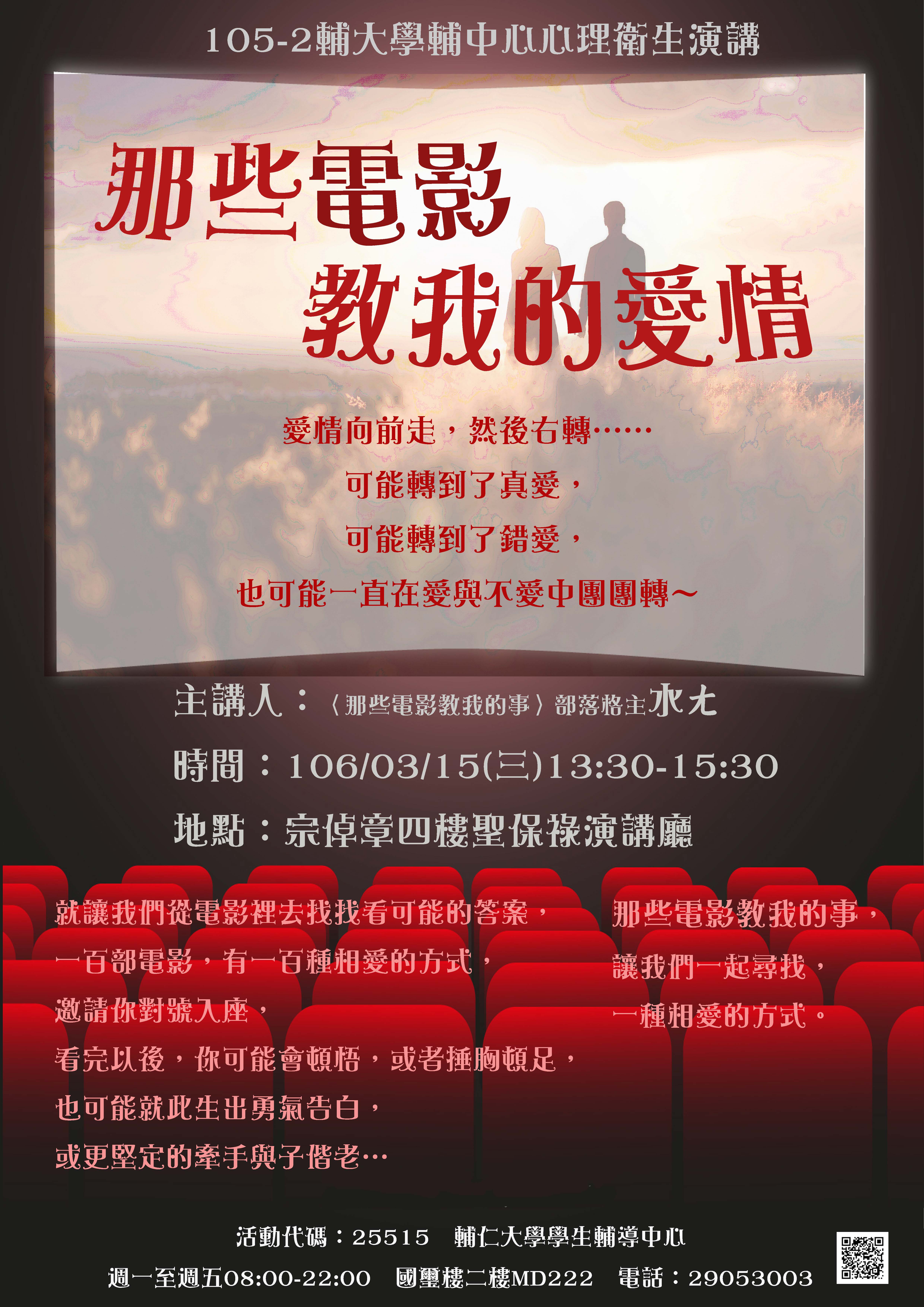 106/03/15「那些電影教我的愛情」心理衛生講座,歡迎踴躍報名!
