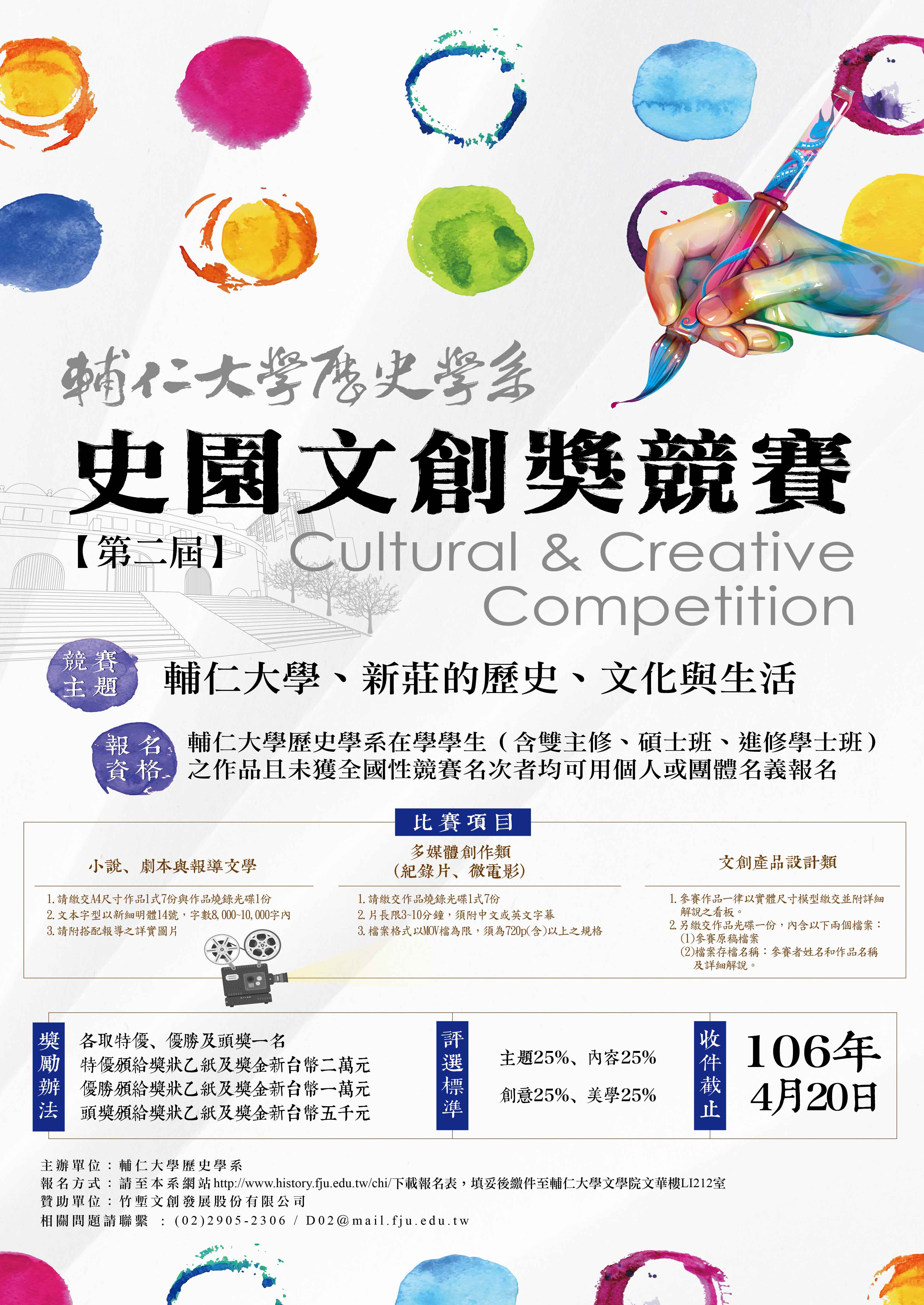 一、 活動宗旨:為鼓勵輔仁大學歷史學系學生跨領域學習,並積極投入文化創意產業,提升創新、創造的競爭力,訂每年舉辦文創競賽,以培育產業界及增加服務社會所需之應用史學人才。