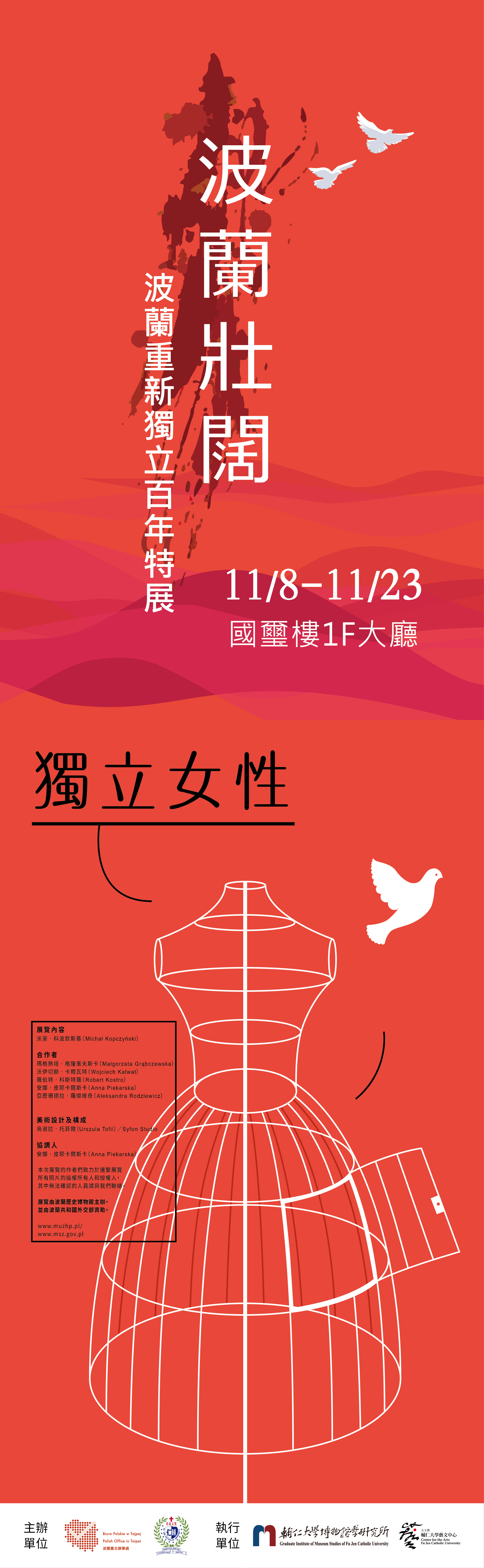 今年適逢波蘭獨立百年,由波蘭台北辦事處與輔仁大學合辦,輔仁大學博物館研究所與藝文中心執行,特別策劃「波蘭壯闊-波蘭重新獨立百年特展」,集結波蘭國家記憶研究院、波蘭歷史博物館以及波蘭臺北辦事處,以優美的圖文道出波蘭人追求獨立自由的壯闊歷史。