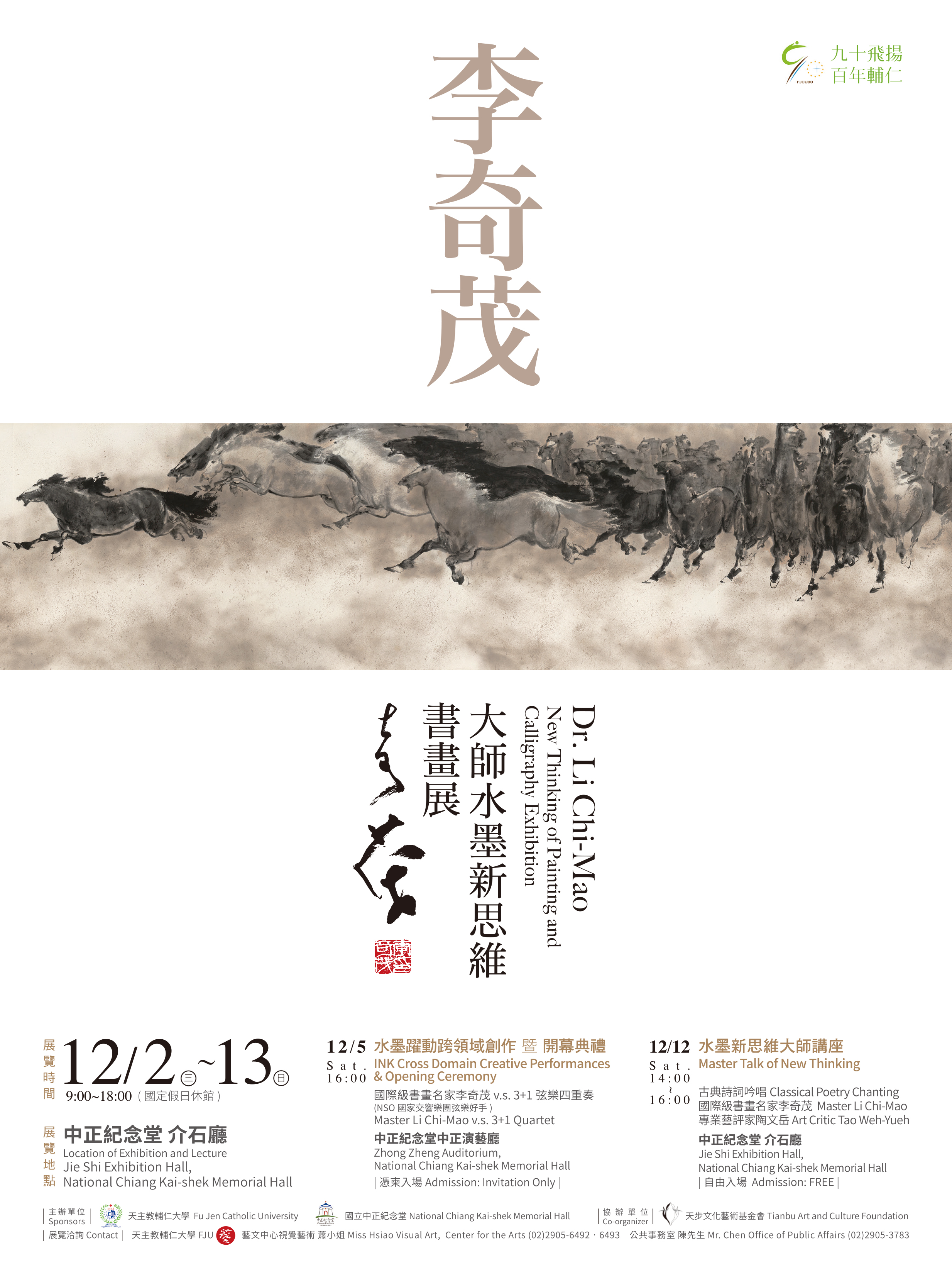 李奇茂大師為享譽國際的書畫名家,二○一四年獲頒本校藝術學名譽博士時,曾預告將與校方共同策展,喜迎輔仁大學創校九十週年。此展由天主教輔仁大學與國立中正紀念堂合作舉辦,並定名「李奇茂大師水墨新思維書畫展」。 年屆耄耋的李奇茂大師至今仍創作不輟,肩負傳承使命,實為受人景仰的現代水墨畫大家。其所涉獵之範疇不單只是藝術本身,更導向背後崇高的文化意涵與精神層次,例如致力於國際傳播、兩岸交流,以及教育紮根等事務。放眼當今社會所彌漫的功利主義與權力競逐,大師卻返璞歸真,一如往昔地將熱忱投入到廣大群眾的日常生活。不論是對於周遭事物的感知,或者受信仰所傳達出的共鳴,他皆以雄健的筆墨,揮灑真摯的情感與人文關懷,實現輔仁大學一直以來所遵循之「真善美聖」的全人教育精神。本次展覽活動為輔大九十年校慶年的重大活動之一,歡迎全體師生踴躍前往參觀與支持!
